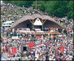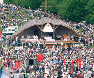 A csíksomlyói barokk kegytemplom "mint osi Mária-kegyhely" nemzeteket és nemzedékeket vonz a nagyságával, szépségével és csodatévo erejével. A pünkösdi zarándoklatokat 1567 óta, vagyis a Tolvajosi gyoztes csata után tartják, annak emlékére, hogy a csíki és a gyergyói katolikusság elhárította szüloföldjérol az eroszakos hittérítés veszélyét. A Napba öltözött Asszonyt ábrázoló reneszánsz kegyszobor a zarándoklatok középpontjában áll.